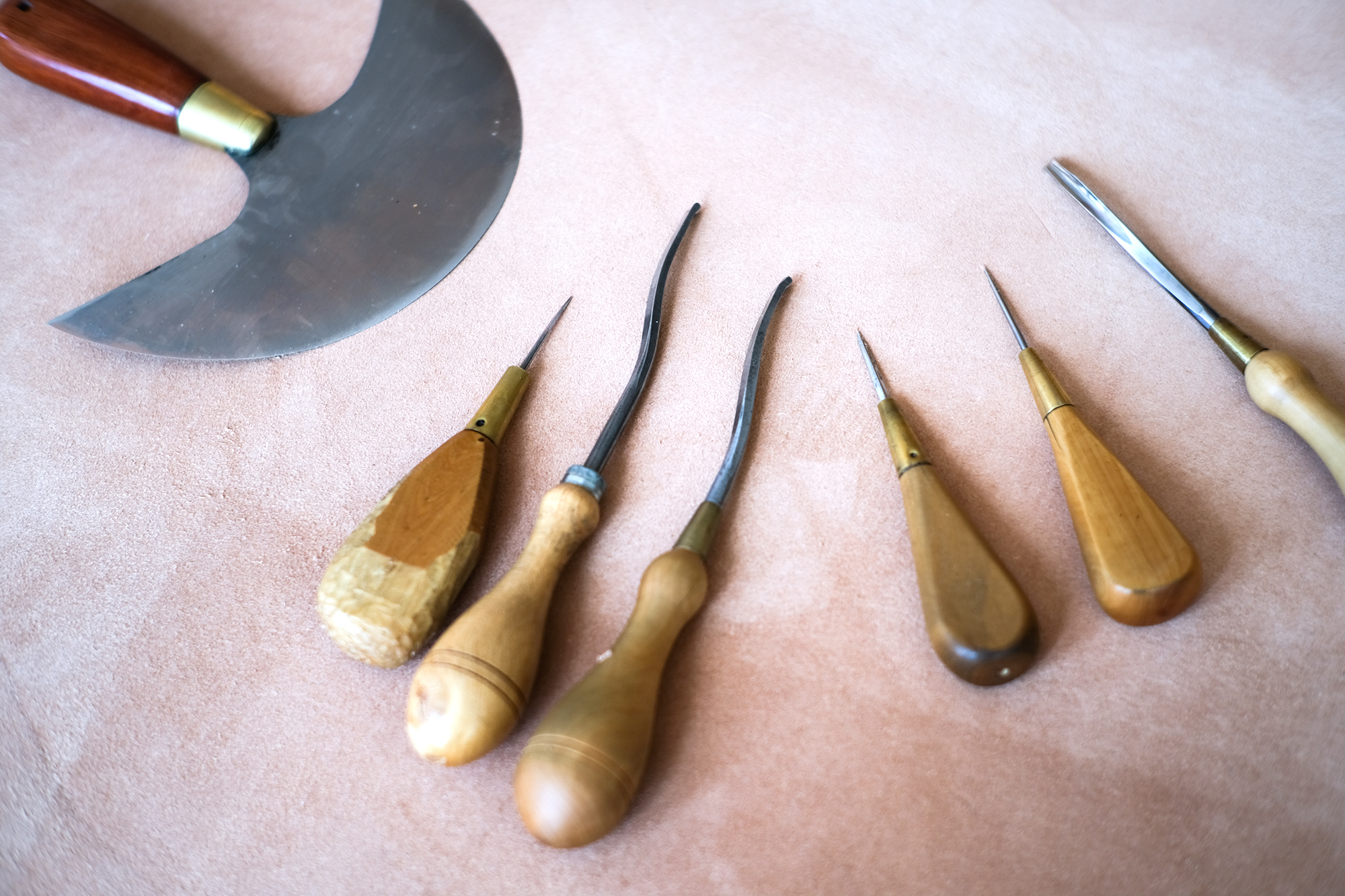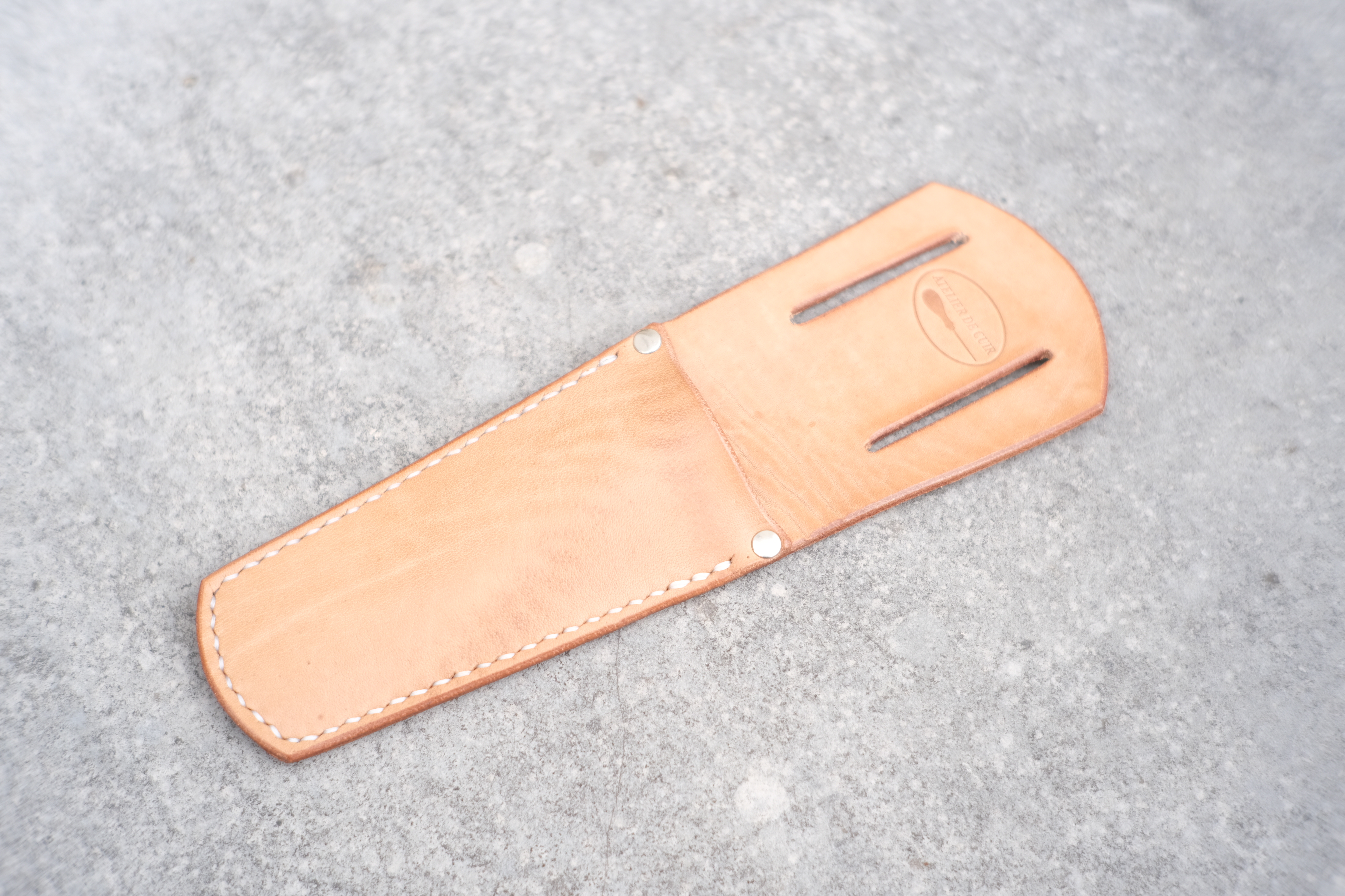 Pour les produits que je fabrique, je travaille exclusivement avec des cuirs de haute qualité à tannage végétal, principalement des peaux de chèvre de Suisse, qui sont tannées dans une tannerie traditionnelle de l'Emmental.