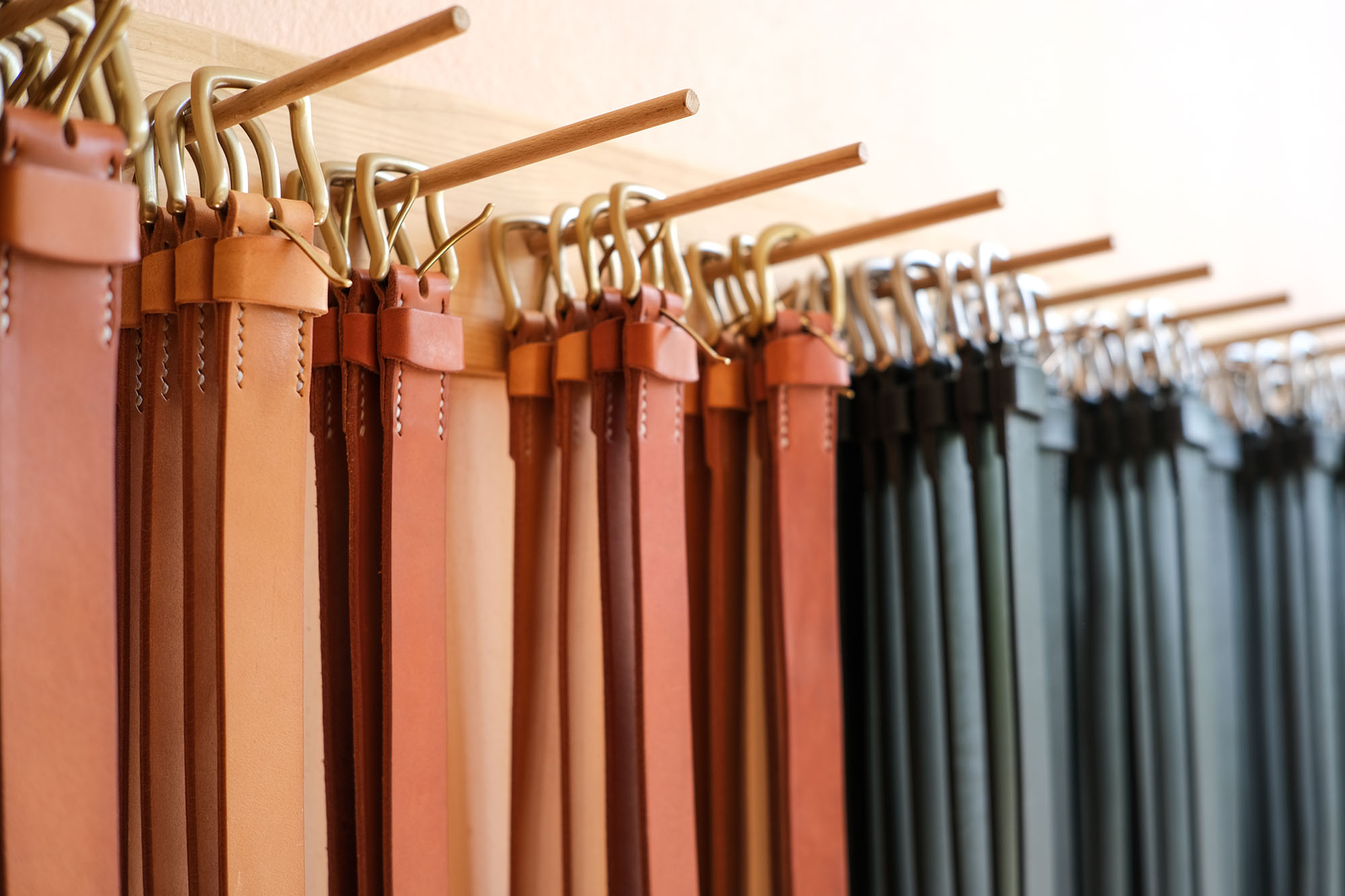 Ici, je fabrique toutes sortes d'articles en cuir à la main. Il s'agit notamment de portefeuilles, de pochettes et de sacs en cuir, ainsi que de ceintures cousues main.